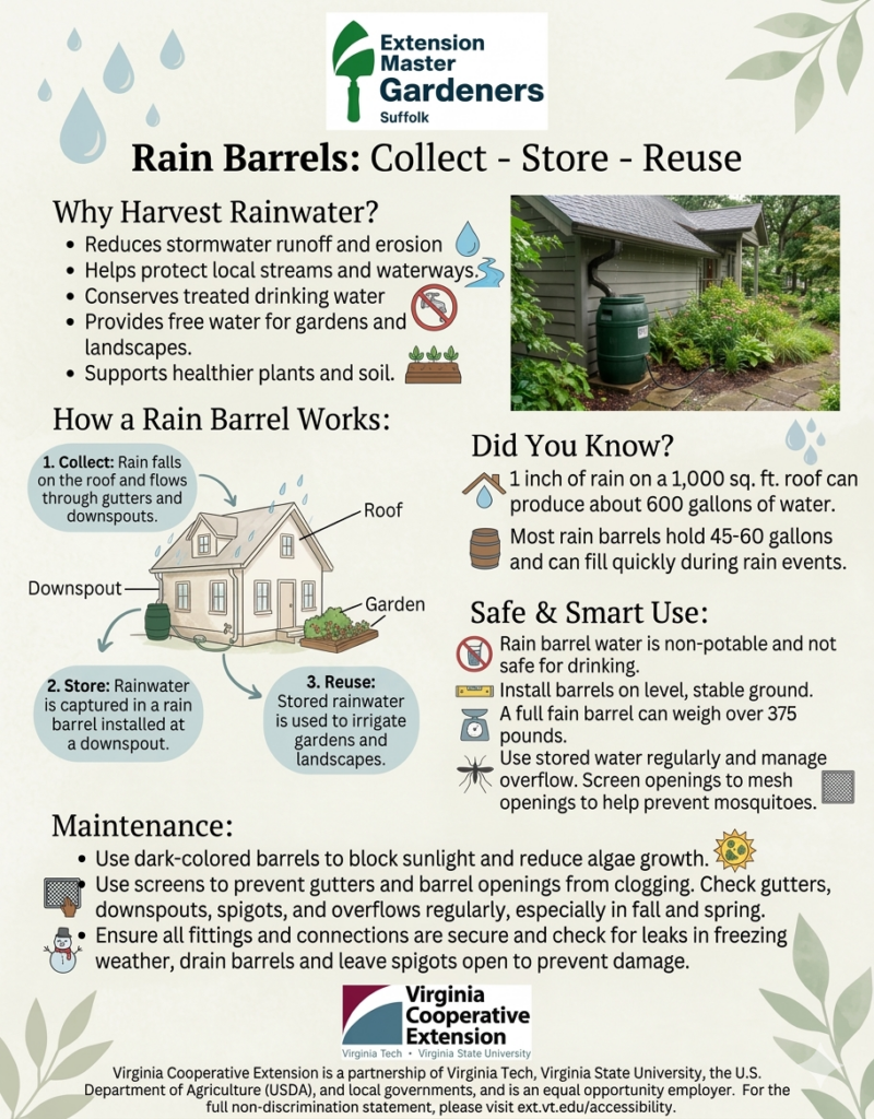 Suffolk Master Gardeners is excited to offer a Rain Barrel Workshop for community members interested in conserving water and making use of natural rainfall at home.