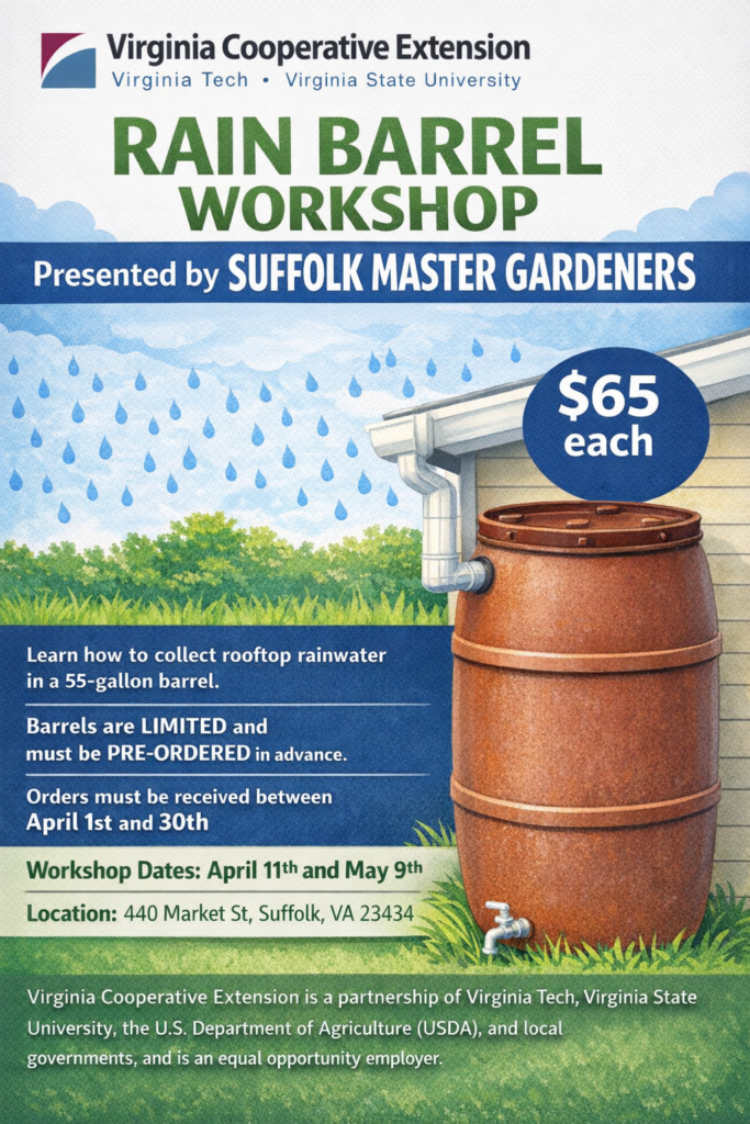 If you are a person with a disability and desire any assistive devices, services, or other accommodations to participate in this activity, please contact Andrea Slye, VCE City of Suffolk, at 757-514-4337/TDD 800-828-1120 during business hours of 9:00 a.m. and 4:00 p.m. to discuss accommodations five days prior to the event.